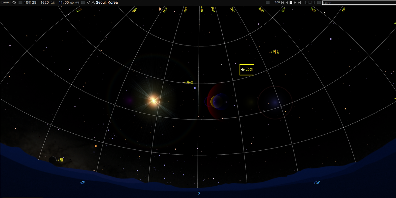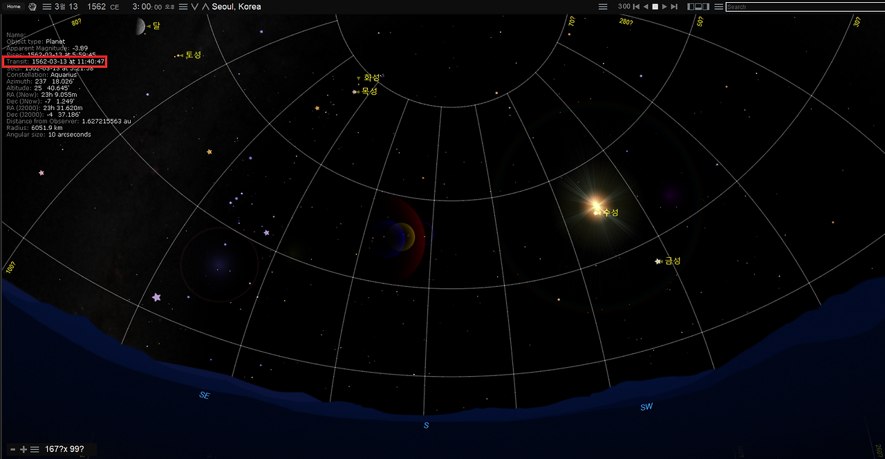 첫 번째인 명종 17년, 1562년 음력 2월 9일은 양력 3월 13일이다. 태백(금성)은 경천하였고, 신시(오후 3-5시)에 세성(목성)이 사지, 즉 동남쪽 방향에서 나타났다고 한다. 이 날 오후 3시의 하늘의 모습은 아래와 같다.