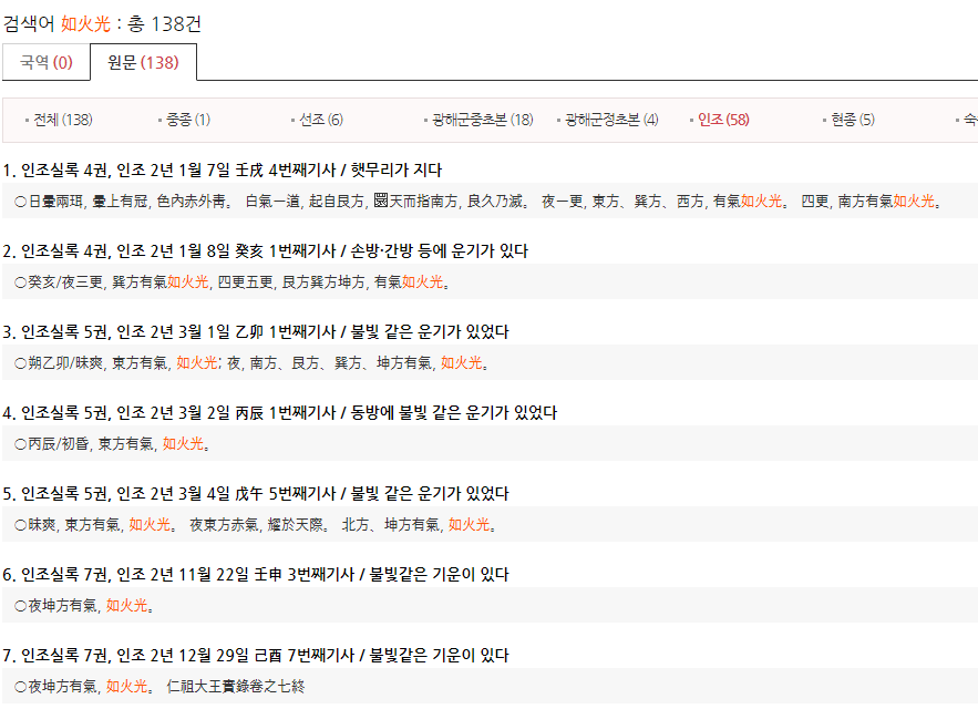 위와 같이 실록에는 밤에 불빛 같은 기운이 있었다는 '유기여화광(有氣如火光)'이라는 기록이 나온다. 특히 이 기록은 인조실록에 집중적으로 나타나며, 때로는 적색, 녹색이거나 백색인 경우도 있는 것으로 보아 오로라를 나타내는 것으로 추정하고 있다.
