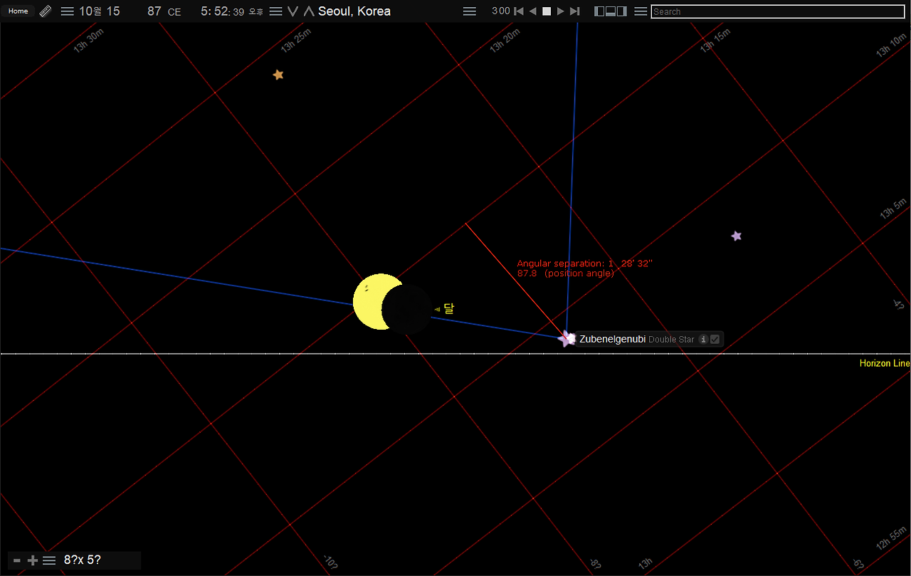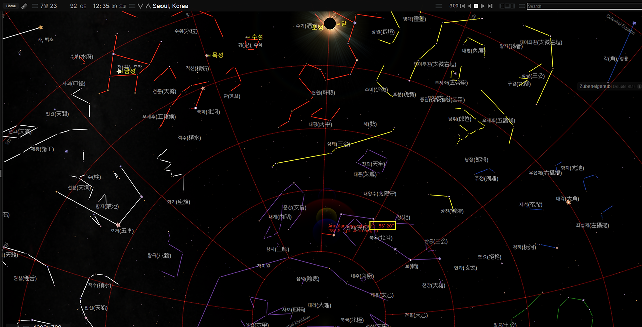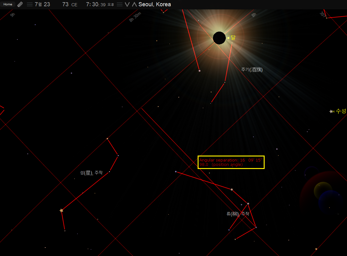 여기서 흰색 가로선이 지평선을 나타낸다. 당시 위례성의 위치와 차이가 없는 서울에서 일식이 충분히 관측할 수 있었음을 알 수 있다. 일식 시점의 태양의 경도는 저(氐) 수 별자리의 수거성인 천칭자리 알파별 주벤엘게누비와는 약 1.5도로 후한서 오행지 기록상의 4도와는 다소 차이가 있다.