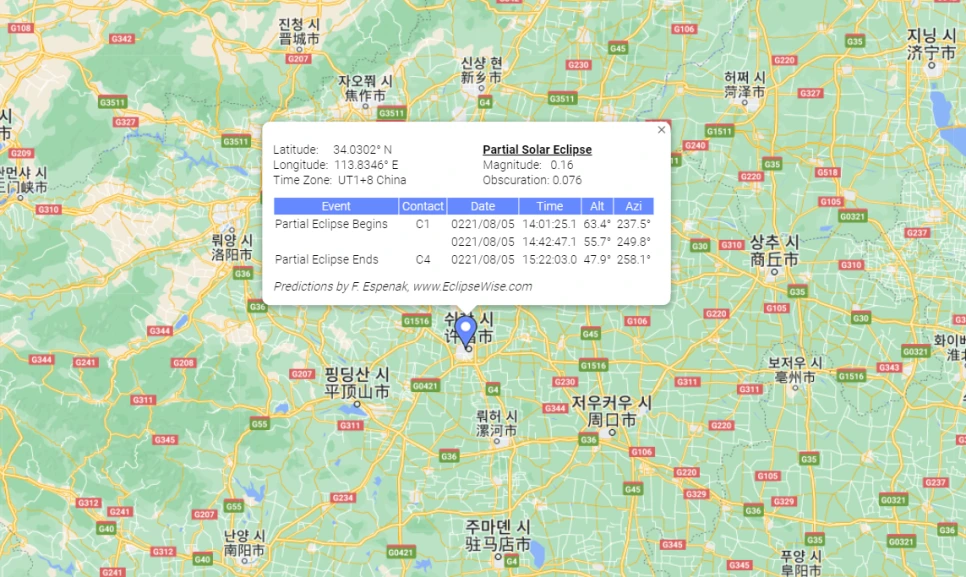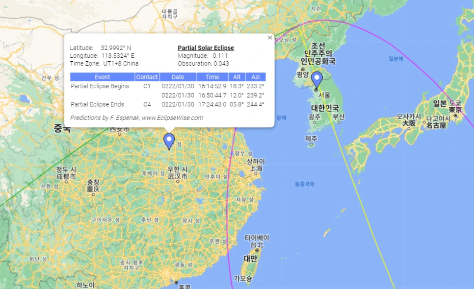 난징의 바로 옆, 달의 본그림자가 지나간 곳에서 개기일식은 8시 30분 전후에 나타났다. 그러니까 정확히 진초~사시까지 있었던 것이다.