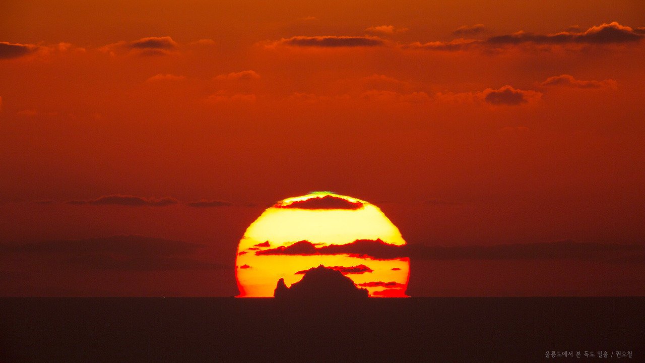 위 사진은 2014년 천체사진가 권오철 님이 3년의 고생 끝에 얻은 울릉도에서 바라본 독도 일출 사진이다. 이제 10년이 다 되어가는데 후배들이 다른 날 다른 시각에 찍었다는 같은 사진이 나오지 않는 것을 보면 육지에서 울릉도를 간다는 것부터도 쉽지 않거니와 관측자의 위치와 독도, 그리고 태양이 일직선을 이루는 상황이 얼마나 드문지 쉽게 알 수 있다.