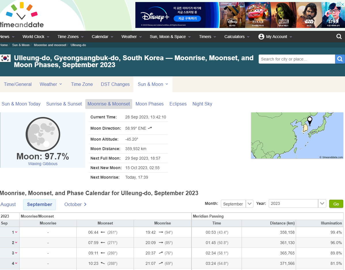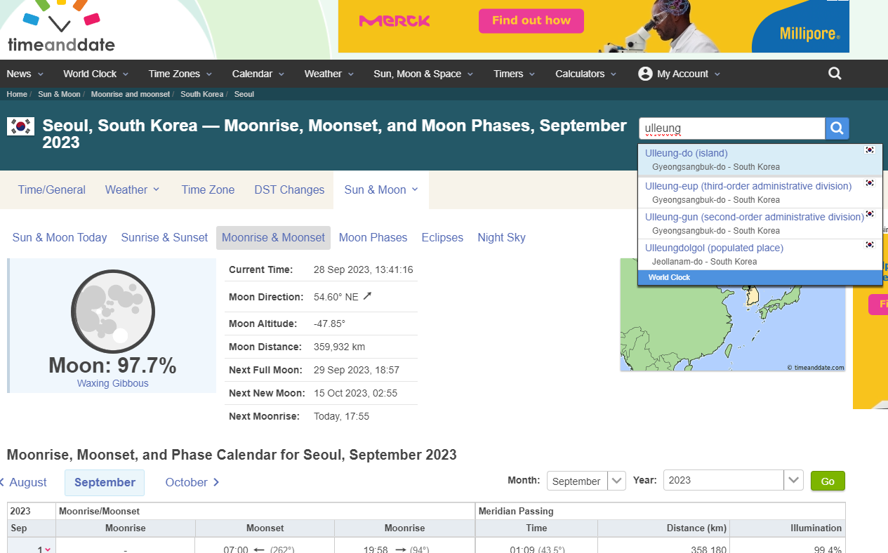 여기에는 Moonrise calculator라는 기능이 있어 역시 특정 위치에서의 달이 뜨고 지는 시각과 방위각, 달의 위상 등을 제공한다. 심지어 관측자 위치를 검색할 때 아래와 같이 울릉도까지 지원이 되는 사이트다.