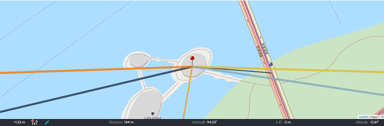 날짜는 화면의 상단에서 바꿀 수 있고, 위치 또한 검색 창을 열어 주요 도시로 이동할 수도 있다. 다음은 위와 같이 촬영자 위치를 선택한 후 우측 붉은색 핀 아이콘 아래에 있는 회색 핀 아이콘을 누르면 관측자가 바라보는 목표 지형을 찍을 수 있다. 예컨대 아래 그림과 같이 말이다.