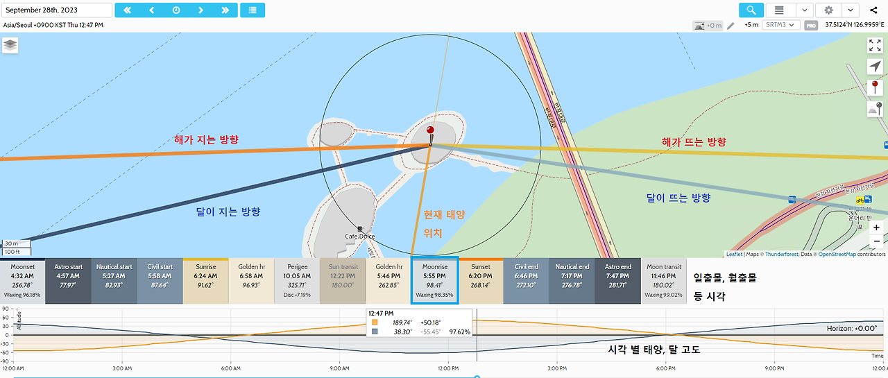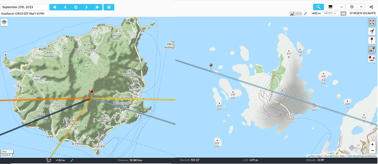 어제 날짜(23년 9월 27일)에서의 달이 뜨는 방향을 독도 방향과 일치시켜 보았다. 물론 어제 날씨는 전국적으로 비 또는 흐림이었고, 달의 위상이 아직 보름달이 안돼서 월출 시각이 오후 5시 12분이다. 어쨌든 이런 식으로 월출 시각과 달의 위상까지 생각해야 되니 흔하게 찍을 수 있는 사건이 아니다.