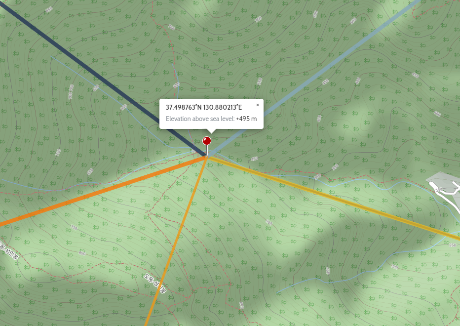 이렇게 설정한 붉은색핀을 한번 클릭하면 위도, 경도 좌표와 해발 고도까지 알려준다. 이 위치가 정확히 등산을 해서 도달할 수 있는 위치인지, 앞에 시야를 가리는 장애물이 있는지 없는지는 촬영자가 알아내야 할 몫이다. 만약 적합하지 않다 싶으면 같은 경로의 다른 위치를 최종적으로 찾아내야 한다.