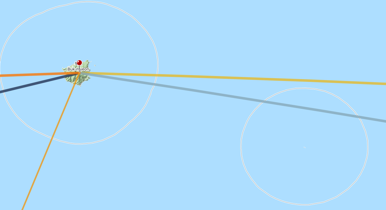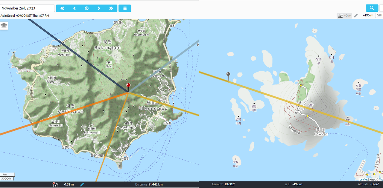 여기서 울릉도에서 독도를 바라보는 방향의 방위각은 107.8도 정도 됨을 알 수 있다. 직접 해보면 아는데 울릉도에서도 위치를 조금만 바꿔도 붉은색-회색 핀을 잇는 선과 일출선이 바로 어긋나 버린다. 즉, 11월 2일에 울릉도에 갔어도 울릉도의 모든 위치에서 독도와 태양이 겹치는 게 아니라 특정 위치에 가야만 볼 수 있다는 것이다. 마치 개기일식처럼 말이다.