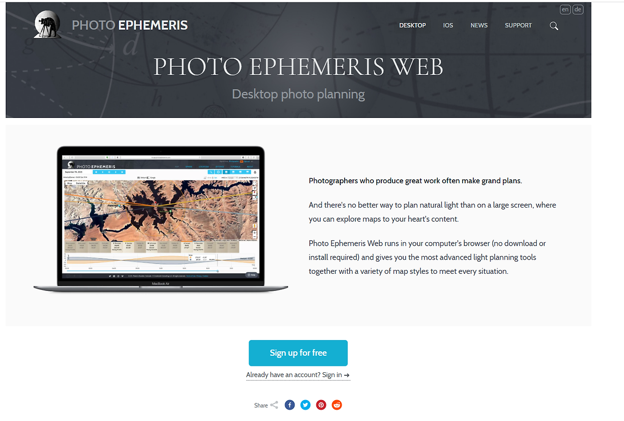 사실 예전에는 The Photographer's Ephemeris라고 해서 TPE라고 부르던 사이트이다. Ephemeris는 천체력이란 뜻으로 태양과 달 등 천체의 일출, 일몰 시각을 수록한 표를 말한다. 여기서 한발 더 나아가 TPE는 구글 맵에서 촬영자의 위치를 입력했을 때 날짜에 따라 태양과 달이 정확히 언제 뜨고 지는지, 그리고 어디서 뜨고 지는지를 확인할 수 있다.