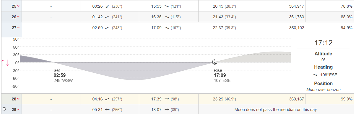 울릉도에서 달이 뜨는 방향이 107도가량 되는 날을 찾으면 된다. 앞서 언급했듯이 달이 107도 방위각에서 뜨는 날은 흔하지 않다. 그런데..