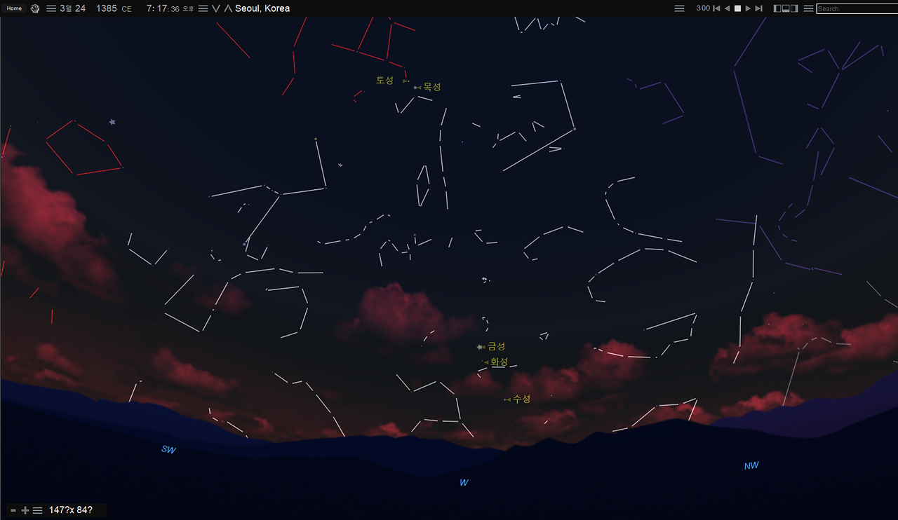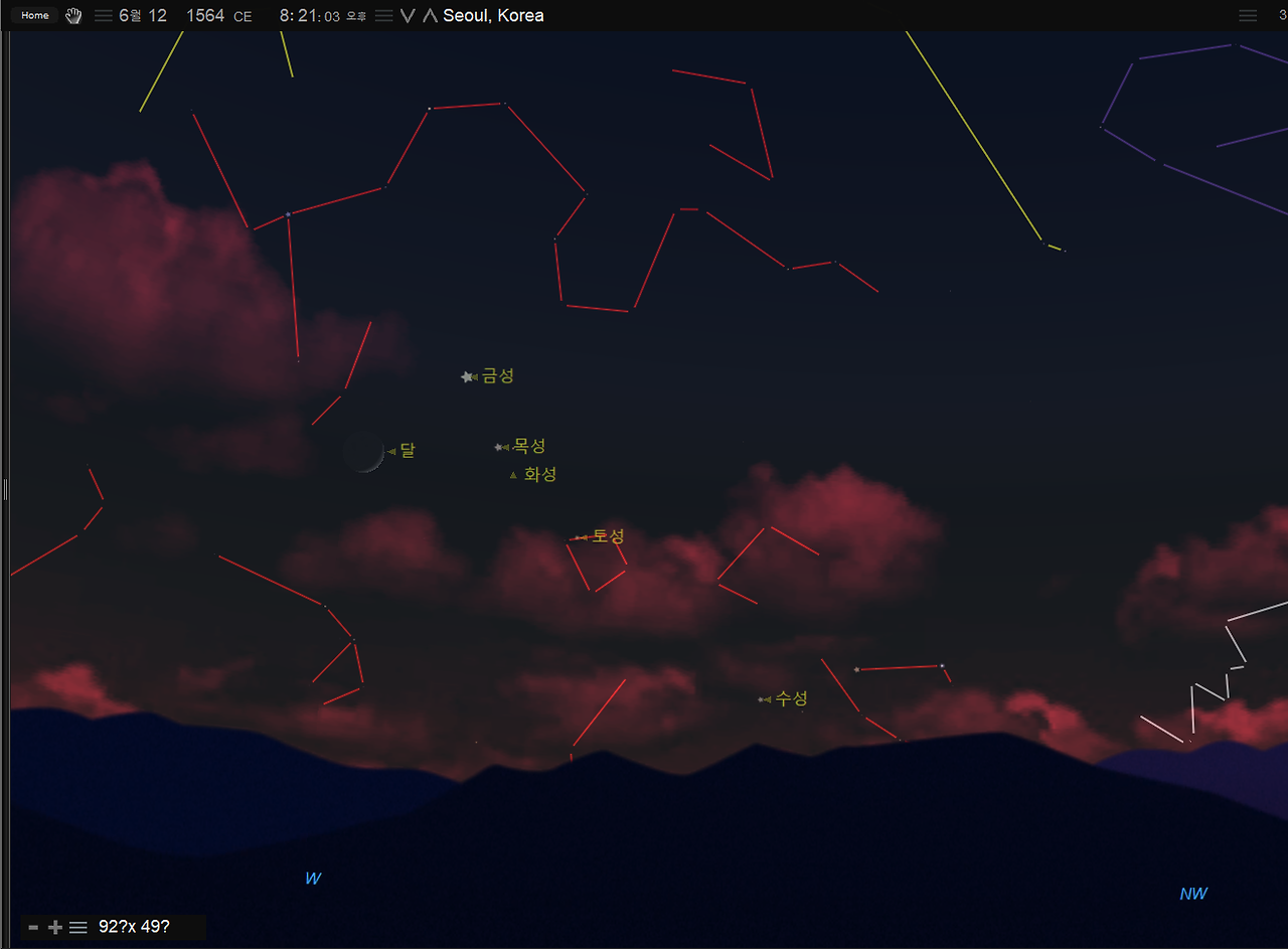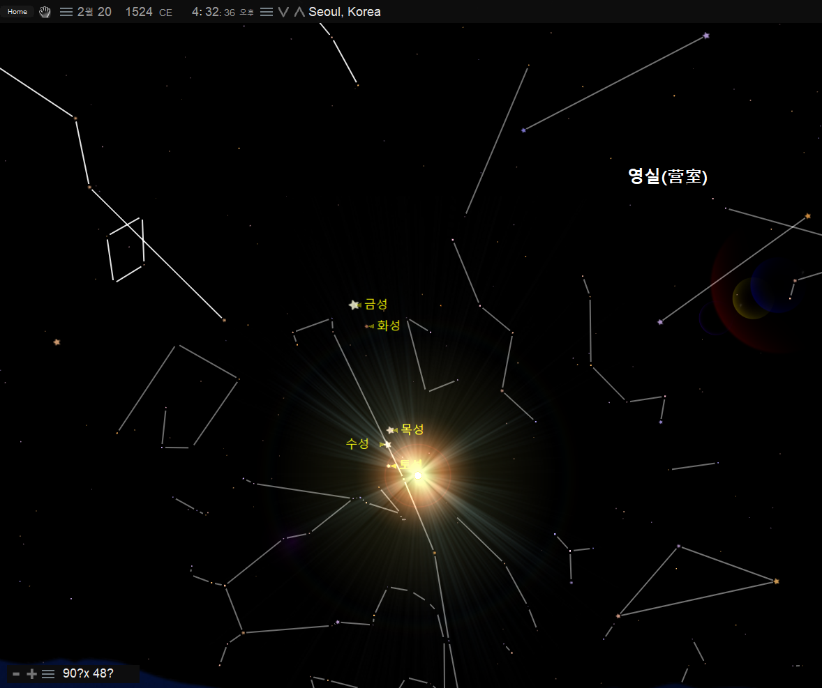 이번에는 함께 구(俱)를 써서 '오성이 함께 보였다'로 해석할 수 있는 기록이다. 이 날의 밤하늘의 모습을 살펴보자.