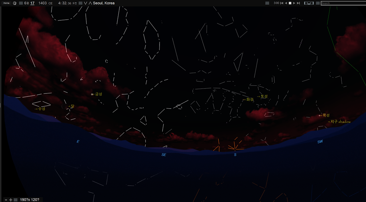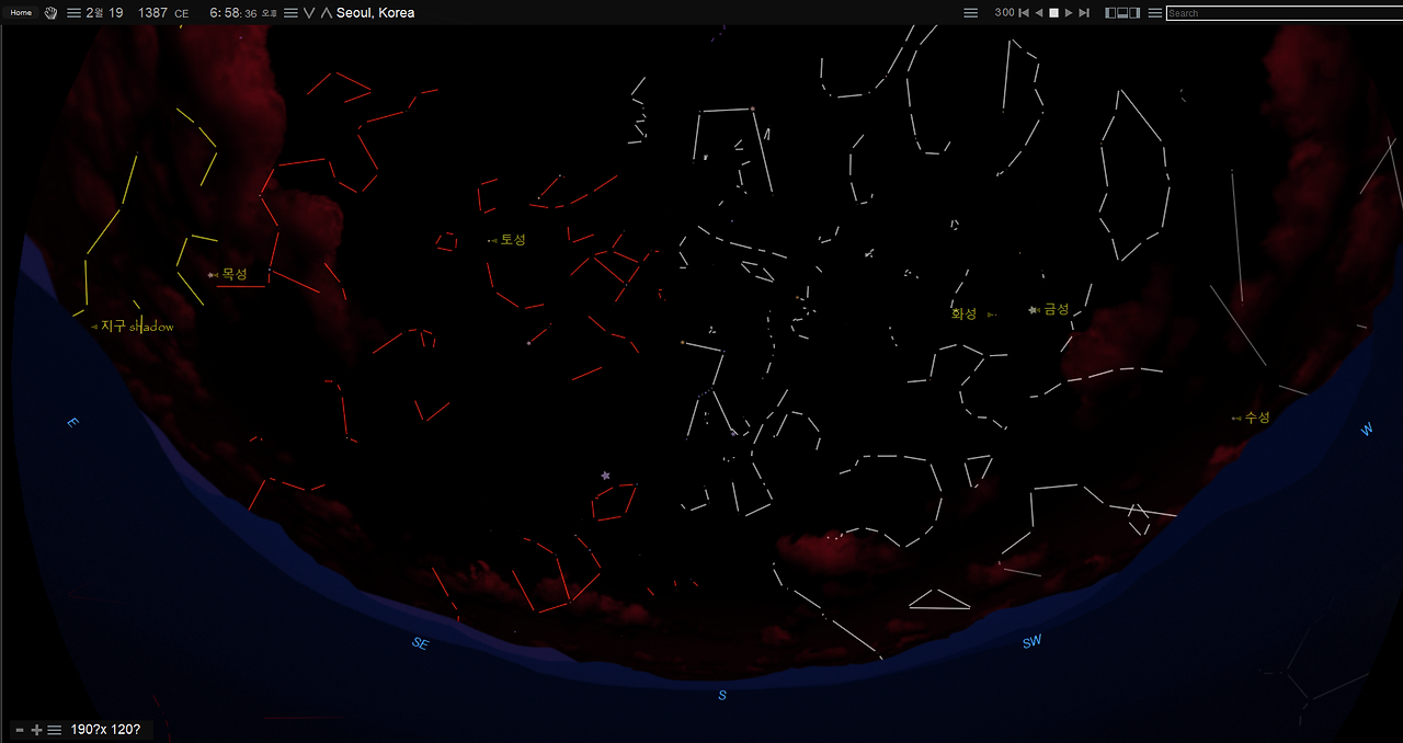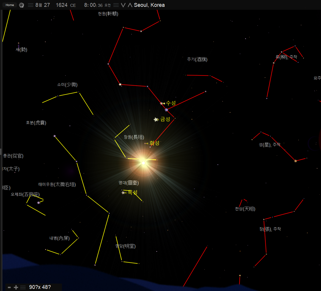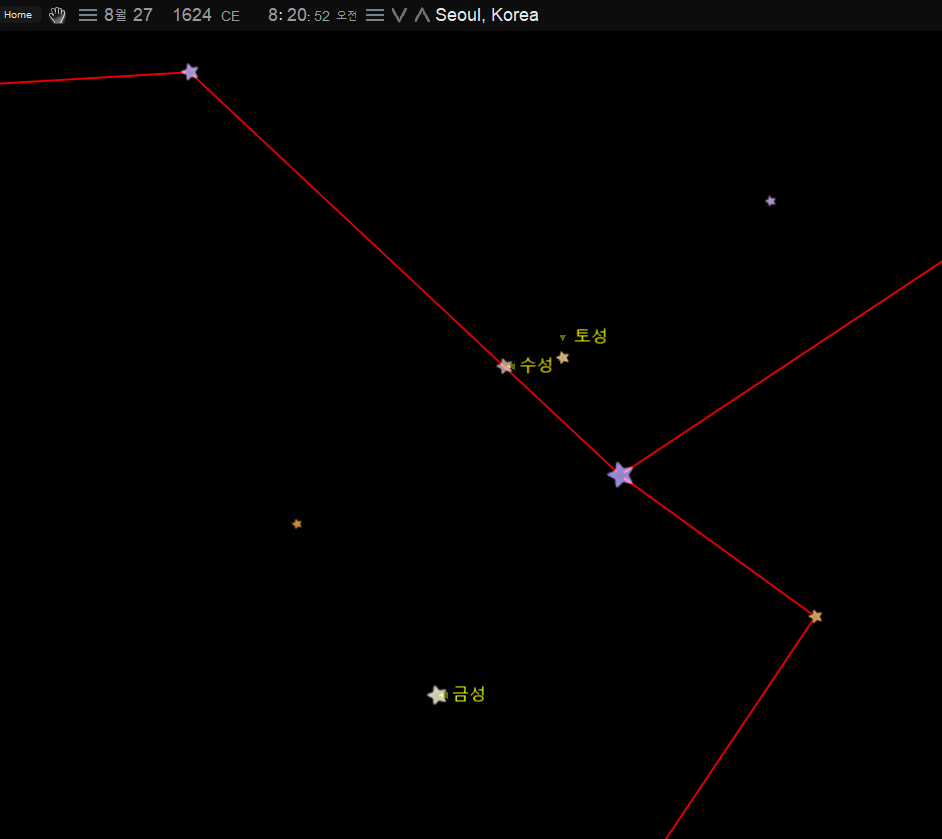 이번에는 함께 구(俱)를 써서 '오성이 함께 보였다'로 해석할 수 있는 기록이다. 이 날의 밤하늘의 모습을 살펴보자.