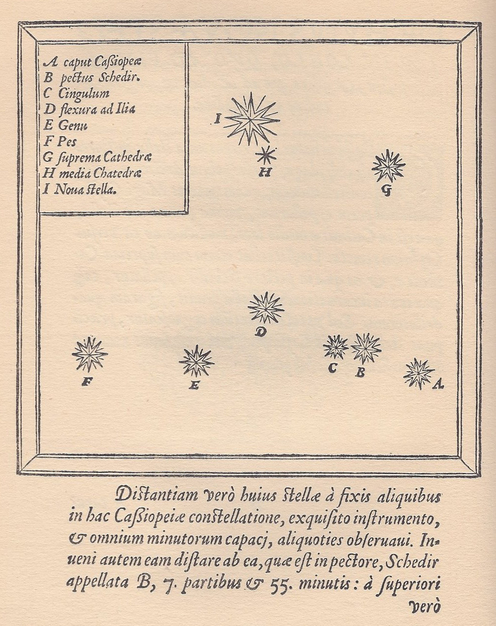 1572년 11월 2일, 북쪽 밤하늘의 대표 별자리인 카시오페이아 자리에서 초신성이 폭발하였다. 이것을 최초로 발견하였는지는 몰라도 이듬해 관측 기록을 책으로 출판하여 세상에 널리 알린 사람이 유명한 관측 천문학자인 티코 브라헤이기 때문에 이 초신성을 '티코의 초신성'이라 부르기도 한다. 현재 초신성 잔해(Supernova Remnant) 목록에 SN1572로 기재되었고 카시오페이아자리 B라고도 부르는 이 초신성은 발견 시점인 1572년 11월에 -4등급의 밝기였다고 한다. 티코 브라헤는 그의 저서 《드 노바 에트 눌리우스 아이비 메모리아 프리우스 비자 스텔라 (De nova et nullius aevi memoria prius visa stella)》("누군가의 생애 중이나 기억상으로도 본 적인 없는 새로운 별에 대하여", 1573년 초판, 1602년 및 1610년 요하네스 케플러의 감수에 의하여 재판됨)에 초신성의 위치에 대하여 아래와 같이 그려 놓았다.(출처 : 위키피디아)
