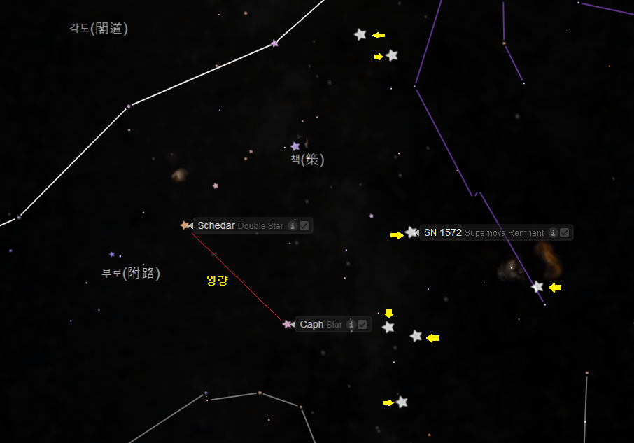 왕량 1성과 2 성은 위에 카시오페이아 자리를 W자형으로 보았을 때 가운데 카시오페이아 감마별의 오른쪽 두 별인 알파(Caph)와 베타(Schedar)이다. 그러나 아래 그림의 붉은 선인 두 별 사이에는 초신성 잔해가 발견되지 않았다.
