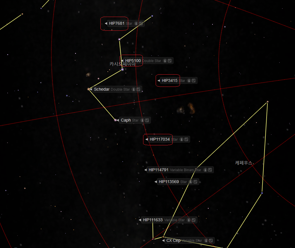 아쉽게도 카시오페이아 알파와 베타 사이에 정확히 있지는 않지만 HIP3415(WR1), HIP5100(WR2), HIP7681(WR3), HIP117034(WR158) 별이 북극(그림 오른쪽)을 기준으로 카시오페이아 알파인 카프(Caph) 별 근처에 동서로 위치한 것을 볼 수 있다. WR1,2,3 은 목록의 숫자를 보면 알 수 있듯이 볼프-레이예 별 목록이 처음 생긴 1884년부터 관측되었던 별들이다. 이미 19세기부터 그 밝기의 변화가 관측 천문학자들에게 인식이 되고 있었던 것이다. 150여 년 전에도 밝기 변화가 인식되었던 별이 오백여 년 전에는 어떤 밝기로 있었는지는 알 수 없다.