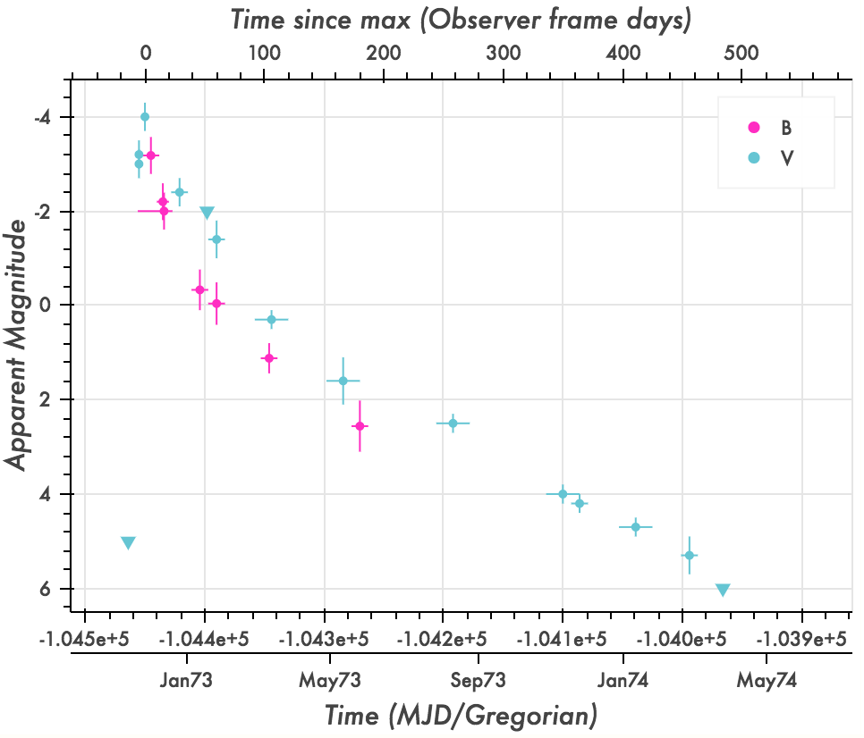 여기서 책(策) 성은 위 그림에 나오는 카시오페이아의 다섯 별 중 가운데인 카시오페이아 감마 별을 말한다. 음력 10월 1일은 양력 11월 6일이며, 밝기의 정도를 금성보다 컸다고 하여 -4등급 정도가 가능할 것으로 예상할 만한 기록이다. 다른 기록에 따르면 이 별은 1574년까지 육안으로 확인이 가능하였다가 이후 소멸되었다고 한다. 아래 그림은 SN1572의 발견 시점에서부터 시간에 따른 광도 변화를 나타낸 그래프이다. 발견시점에서 대략 5-6개월까지도 1등급의 겉보기 밝기 등급을 가졌던 것으로 추측된다.