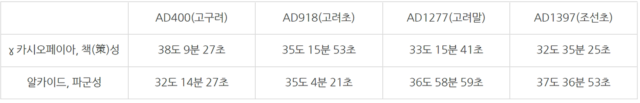 난징과 같은 저위도에서도 주극성이었기 때문이다. 고려가 건국한 918년에는 난징과 시안에서 주극성이 아님을 알 수 있다. 고려 후기에서는 중국의 알려진 도시에서 알카이드는 주극성이 아니다.