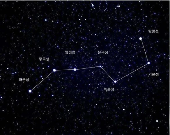 북쪽에 위치해서 종교적인 의미에서 삶과 죽음을 관장한다고 보았는데 동양에서는 아래 그림과 같이 두브헤부터 각각 탐랑, 거문, 녹존, 문곡, 염정, 무곡, 파군성이라는 이름을 붙여 주었다.