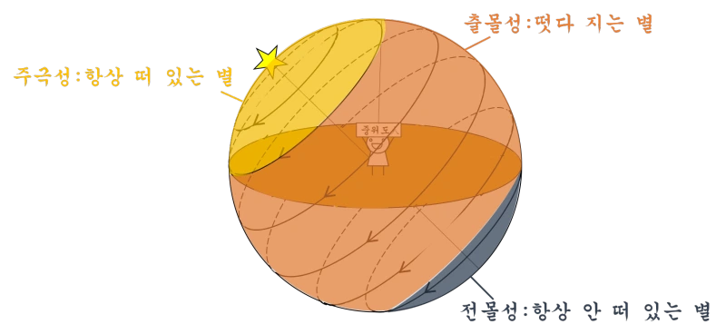 그런데 여기서 중요한 단어가 나오는 데 바로 '주극원'이다. 주극원(週極圓)은 북극으로부터 지평선까지를 반지름으로 하는 가상의 원을 말한다. 즉, 주극원 내에 있는 별들은 아무리 낮아도 지평선보다 위에 있기 때문에 24시간 내내 하늘에 계속 떠 있게 되며 이런 별을 주극성이라 하고, 주극원 바깥의 별들은 떴다가 지기 때문에 출몰성이라고 한다.