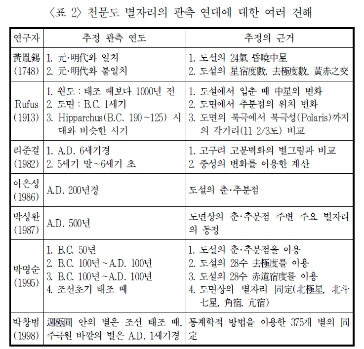 여기서 각 연구자들마다 자신의 견해의 근거로 하는 몇가지가 있는데 도설에 기재된 혼효중성이나, 춘분점, 추분점, 그리고 도면상의 주요 별자리 등이 핵심이라고 할 수 있다.