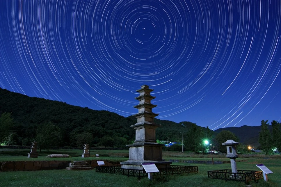 천체 사진의 종류 중 하나인 일주 사진을 볼 때 북극성을 중심으로 동심원을 그려나가는 별들이