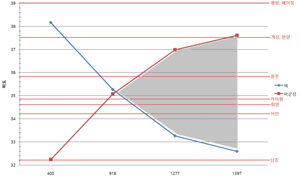 이해하기 쉽게 위의 값을 바탕으로 그래프로 도식화하고 한반도와 중국 대륙의 역사 속 주요도시의 위도를 비교해 보았다. 회색의 영역이 파군성이 출몰성, 그리고 책성이 주극성으로 표시가 가능한 연대와 위도이다.