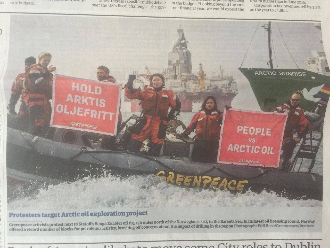 우리의 궁극적인 목표는 이 한대의 석유시추선을 중단하는 것뿐만 아니다. 노르웨이 정부가 북극해에 석유 시추를 허가한 것에 반대해, 그린피스와 네이처 앤 유스가 제기한 반대 소송에서 이겨, 허가된 시추를 궁극적으로 막기 위하여, 이러한 실상을 알리기 위하여 25개국 35명의 사람들이 이곳에 모였다. 또한 북극해의 석유가 그 바닥에 머물게 하여, 궁극적으로는 지구온난화를 막기 위해 이 소송을 제기하게 되었다.
