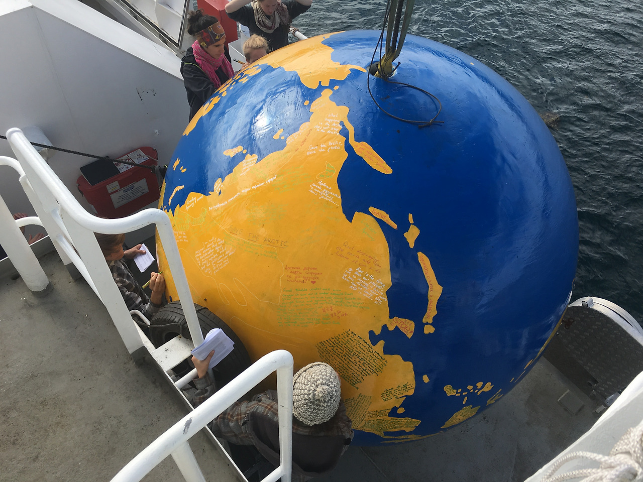 이렇게 석유시추선에게 통신을 하면서, 활동가들은 고무보트와 카약을 타고 우리가 준비한 메시지와 함께 석유시추선으로 접근하기 하였다. 그리고, 우리는 그 메시지가 담긴 지구본을 석유시추선의 앵카 체인에 묶어 전달하였다.