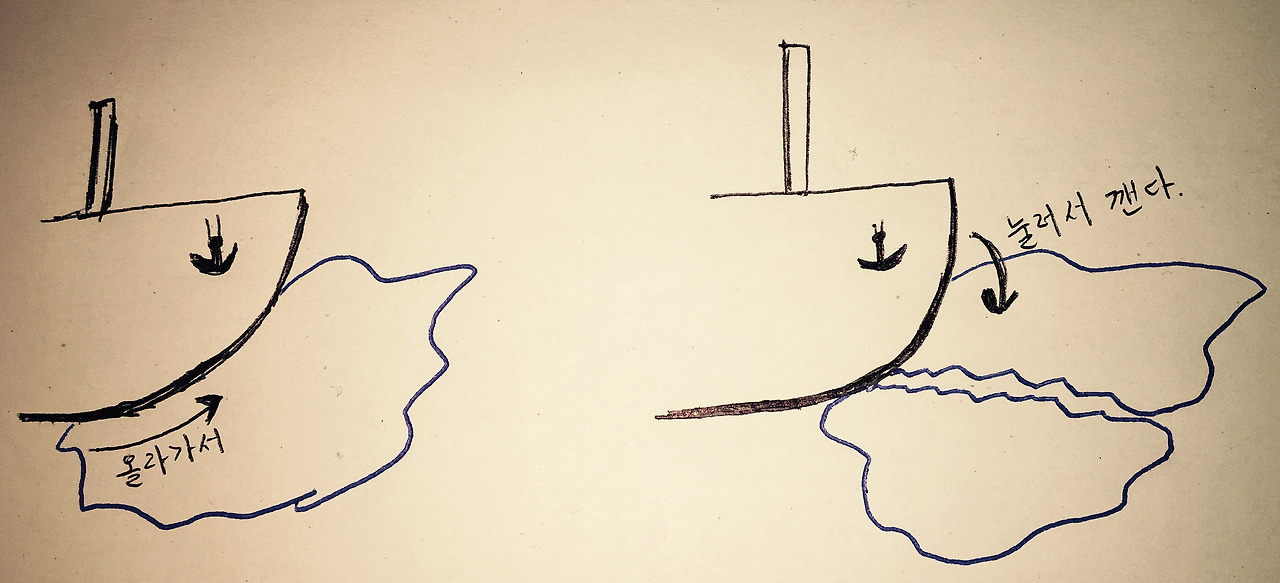 두 번째는 ‘누르기’이다. 얼음이 상대적으로 두꺼워 밀어 치기로 여이치 않을 때, 쇄빙선은 얼음 위로 슬라이딩하듯이 올라간다. 그리고 선박의 무게로 짓눌러 깨뜨린다. 그리고 다시 뒤로 갔다 앞으로가 올라가서 눌러 깨뜨리기를 반복하며 얼음 지대를 통과해 나아간다. 그리고 이 ‘누르기’ 과정을 위해서는 배 앞부분이 둥글둥글해야 잘 올라가기 쉽고, 이를 위해서 우리 배는 선박의 중심추 역할이자 척추에 해당하는 ‘용골(Keel)을 없애고, 원형의 형태로 만들었다. 상대적으로 작은 쇄빙선인 우리 배는 주로 누르기를 하는 경우가 많다.
