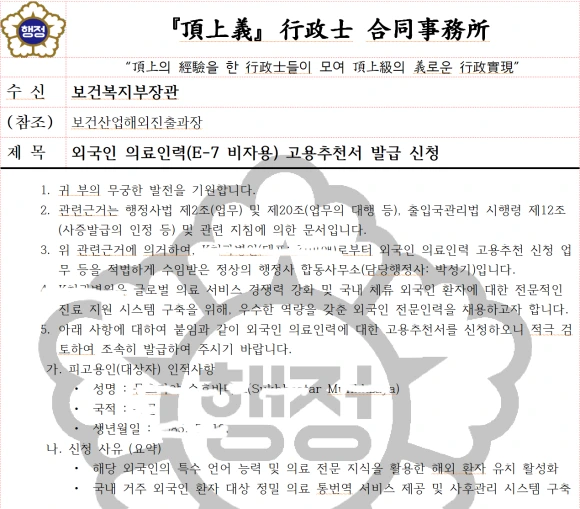 인생의 후반전, 나는 이제 시간을 소비하거나 단순히 축적하는 자가 아니다. 나는 시간을 지배하고 창조하는 자다. 오늘 보건복지부에 보낸 E-7 비자용 고용추천 신청서에는 S*uk***tar M**nkh**라는 외국인 의사의 새로운 꿈이 담겨 있었다. 행정사법과 출입국관리법의 좁은 틈새를 정교한 디테일로 메우며, 나는 그녀의 한국 생활이라는 새로운 디렉토리의 설계를 시작했다.
