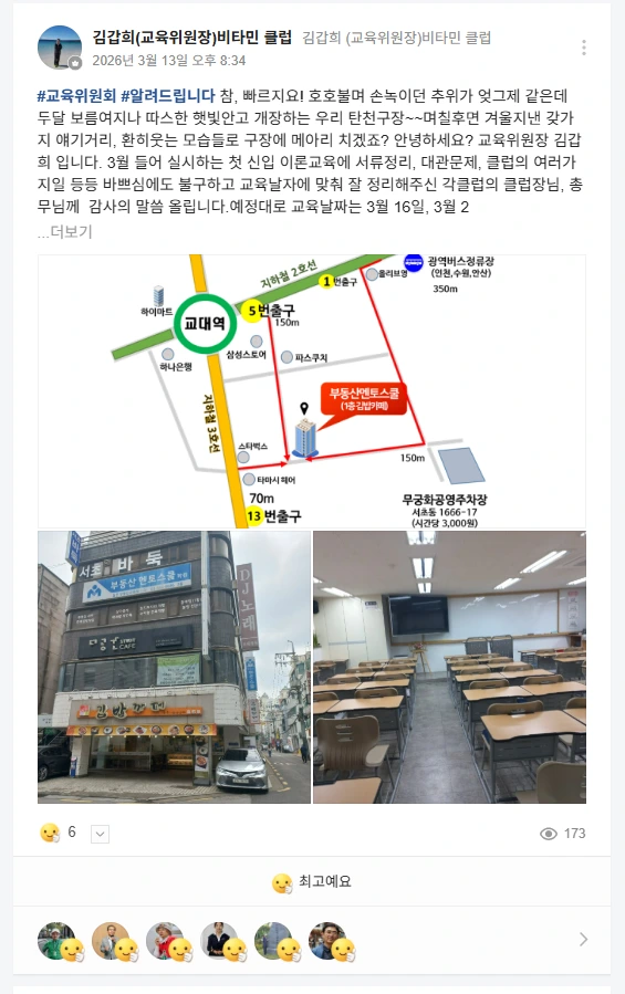 작년 9월, 설레는 마음으로 파크골프에 입문했지만 바쁜 일정 탓에 정식 회원이 되기 위한 관문을 잠시 미뤄둬야 했습니다. 마침내 오늘, 3월 16일. 서초동 부동산멘토스쿨 교육장에서 그토록 기다리던 제1기 이론교육의 첫발을 내디뎠습니다.