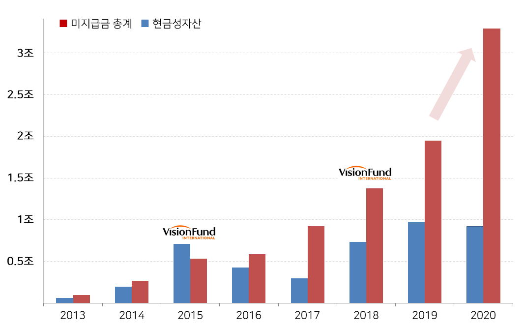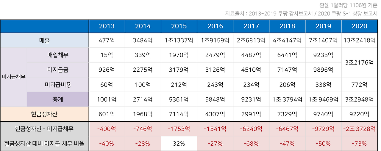 이 그래프에서 주목해야 할 부분이 하나 더 있습니다. 전년도에 비해 현금성 자산이 눈에 띄게 개선되는 년도가 두 곳 있는데요. 바로 비전펀드에게 10억달러를 투자받은 2015년과 20억달러를 투자받은 2018년도입니다. 재무제표가 말해주는건 지금 쿠팡의 사업 구조는 비전펀드가 현금을 수혈해주지 않으면 유지가 안 되는 구조라는 뜻입니다.