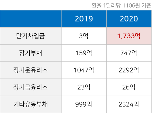 쿠팡의 19~20년 재무제표 중 부채 항목쿠팡의 현금유동성 위기는 뉴욕증시 상장신고서인 S-1 보고서에도 잘 드러나있습니다. 전체적으로 부채가 급증했는데 그중 주목할만한 건 단기차입금의 증가비율입니다. 단기차입금은 이율도 비싸고 1년 안에 갚아야 하는 돈이기 때문에 어지간히 급전이 필요한 게 아니면 잘 땡겨쓰지 않는 돈입니다. 실제로 2019년 쿠팡의 단기차입금은 3억 정도로 매우 적은 금액이었죠.