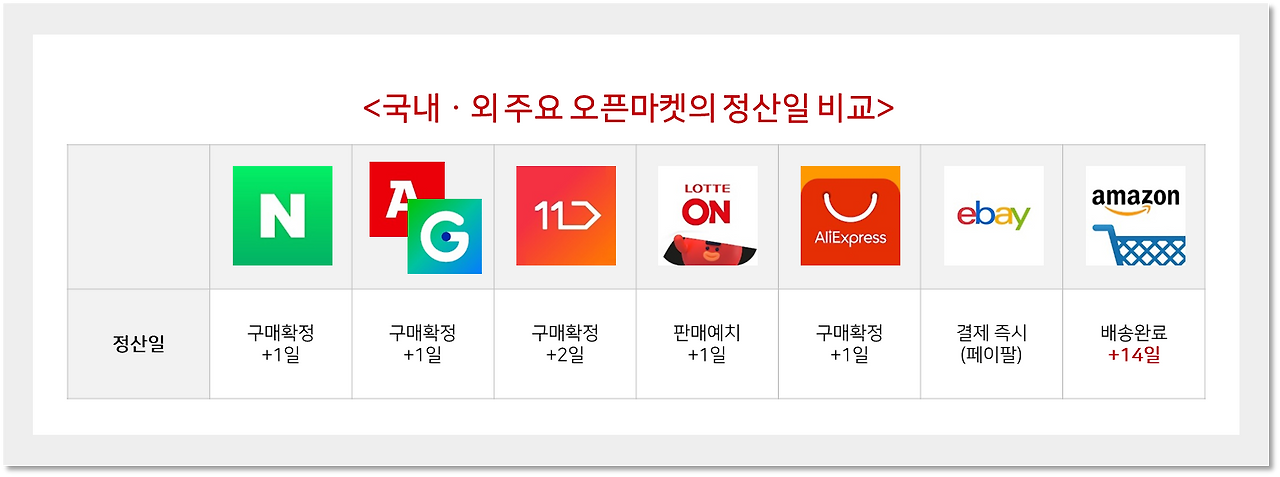 국내 주요 오픈 마켓은 내가 물건을 사고 수령을 받은 다음 구매확정을 누르면 대부분 다음날, 늦어도 이틀 후면 수수료를 제외하고 판매대금을 정산받을 수 있습니다. 이베이만 특이하게 결제수단으로 페이팔을 써서 구매자가 결제한 즉시 판매대금이 내 계좌로 꽃히는 방식이고 (이베이가 셀러평가에 기반한 신용도로 움직이는 시스템이라 가능한 구조) 아마존은 구매확정이 아닌 배송완료 14일 이후로 판매대금을 정산하는 구조입니다. 아마존의 기준이 배송완료일 인건 글로벌 배송을 지원하는 특성상 배송기간이 길어질 수 있기 때문입니다. 구매자가 배송일이 긴 배송 옵션으로 물건을 구매하면 판매자가 물품 대금을 정산받는데 그만큼 시간이 걸리기 때문이죠.
