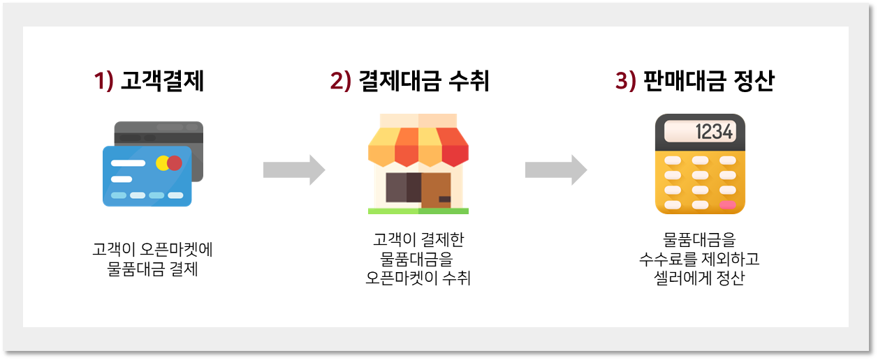 고객이 오픈마켓에서 물건을 구매할 때 결제는 오픈마켓에서 진행하게 됩니다. 결제가 완료되면 오픈마켓은 판매자에게 물품 배송을 요청하고 고객이 물건을 받은 다음 구매확정을 누르면 오픈마켓은 수수료를 제외한 물품 판매대금을 판매자에게 정산하는 구조입니다. 과거에 판매자가 물품 대금만 받고 물건을 보내주지 않거나 하는 결제사기가 빈번하기도 했고 카드결제, 실시간 계좌이체 등 다양한 결제수단을 지원하기 위해 오픈마켓이 거래 중계자 역할을 하는 것이죠. 이를 에스크로(전자안전결제 시스템)이라고 합니다.