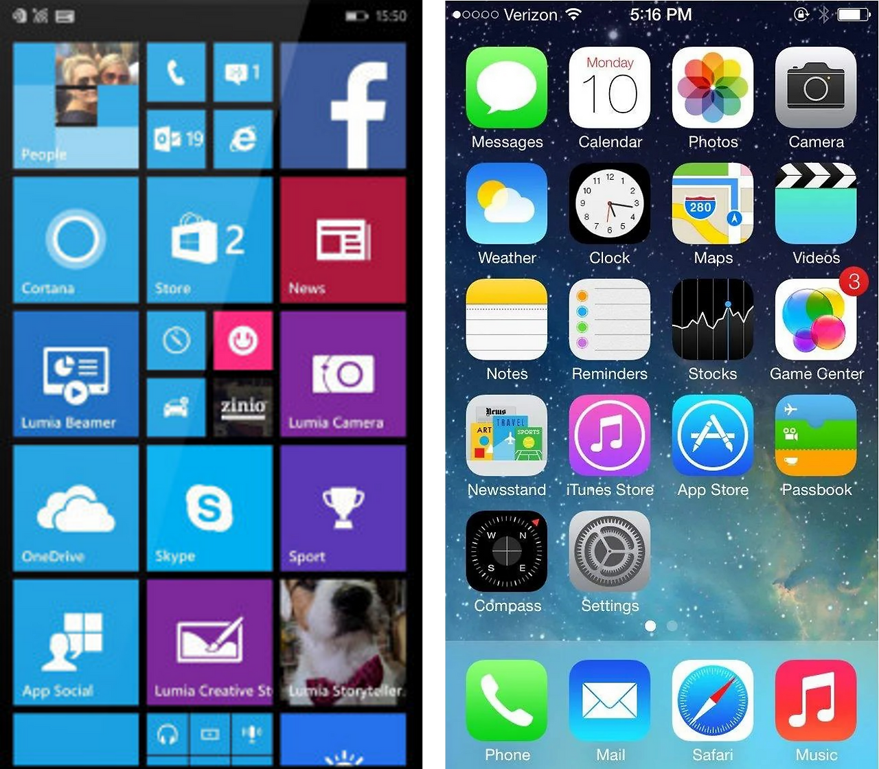 (좌)윈도우폰의 메트로 UI³ / (우)iOS의 플랫디자인⁴