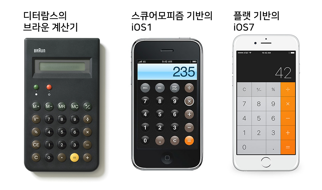 실제 사물을 재현한 디자인은 스마트폰에 익숙하지 않은 사람들에게 주효했지만 사람들이 스마트폰에 점점 익숙해지면서 과도한 장식이 사용성을 저해한다는 비판을 받았다. 대충 계산기 모양이어도 사람들은 다 알아볼 텐데 계산기 모양을 똑같이 모방하는 게 무슨 의미가 있겠냐는 거다.