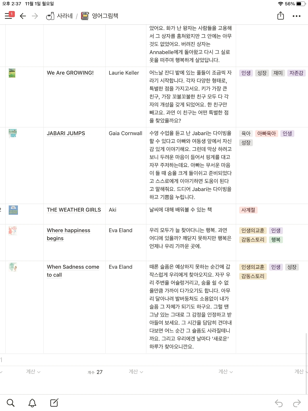 다 읽은 책, 아직 읽고 있는 책, 읽고 싶은 책으로 분류할 수도 있고, 시작 날짜와 완독 날짜까지 캘린더 기능을 이용해 쉽게 체크해둘 수 있다. 그리고 영어그림책만의 독서기록장도 유용하게 사용하고 있다. 내가 생각하는 그 그림책의 키워드를 지정해두면, 나중에 그 키워드를 가진 책들만 찾아볼 수 있는 기능도 있다. 그때 그 때, 떠오르는 생각들은 이제 메모 어플 대신에 노션의 '아이디어' 페이지에 적어둔다. 그래서 자꾸 되돌아보면서 그 아이디어가 그냥 흘러가지 않도록 노력한다. 아이가 했던 말도 그 날짜와 그때의 상황들을 적어두고, 매일매일 가족 구성원들에게 감사일기를 쓰기도 한다. 책상에 앉기 힘들 때는 굳이 그러지 않아도 된다. 핸드폰 하나만 들고 있으면 이 모든 기록들에 접속이 가능하고, 그 기록들을 이어나갈 수 있다.