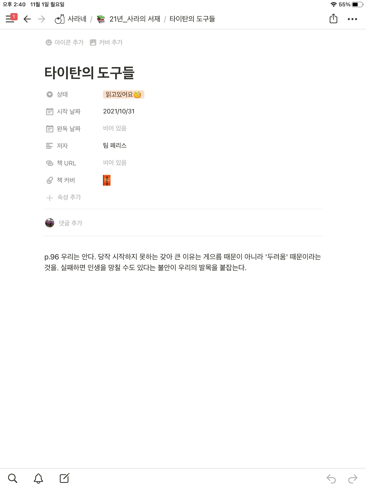 한 번 템플릿을 만들어두니 체크만 하면 돼서 간편했다. 다이어리나 아이패드 굿노트에 여기저기 흩어져 있던 독서기록도 이곳으로 모았다.