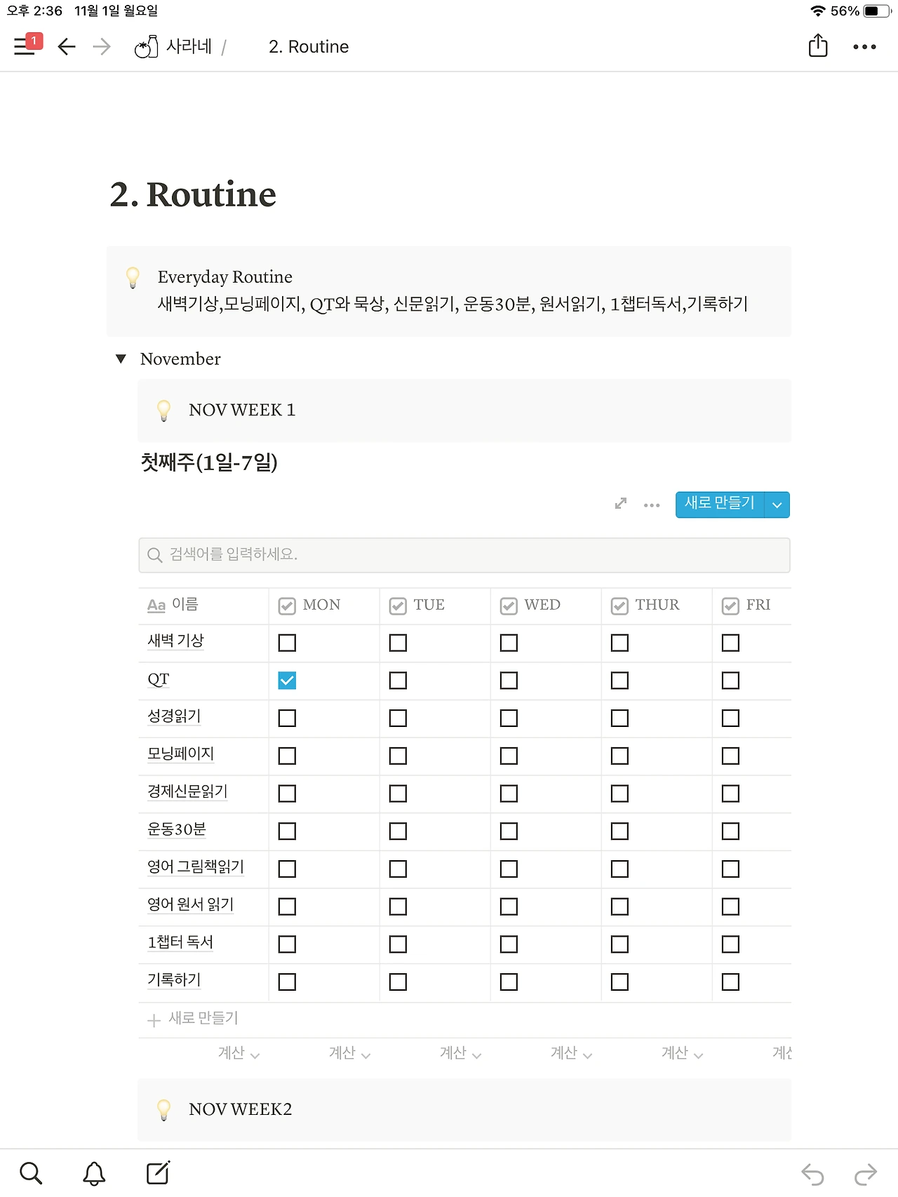 중요한 일정이 있을 때는 캘린더 기능을 이용해 저장해 두고, 루틴 체크표도 이곳에 두었다.
