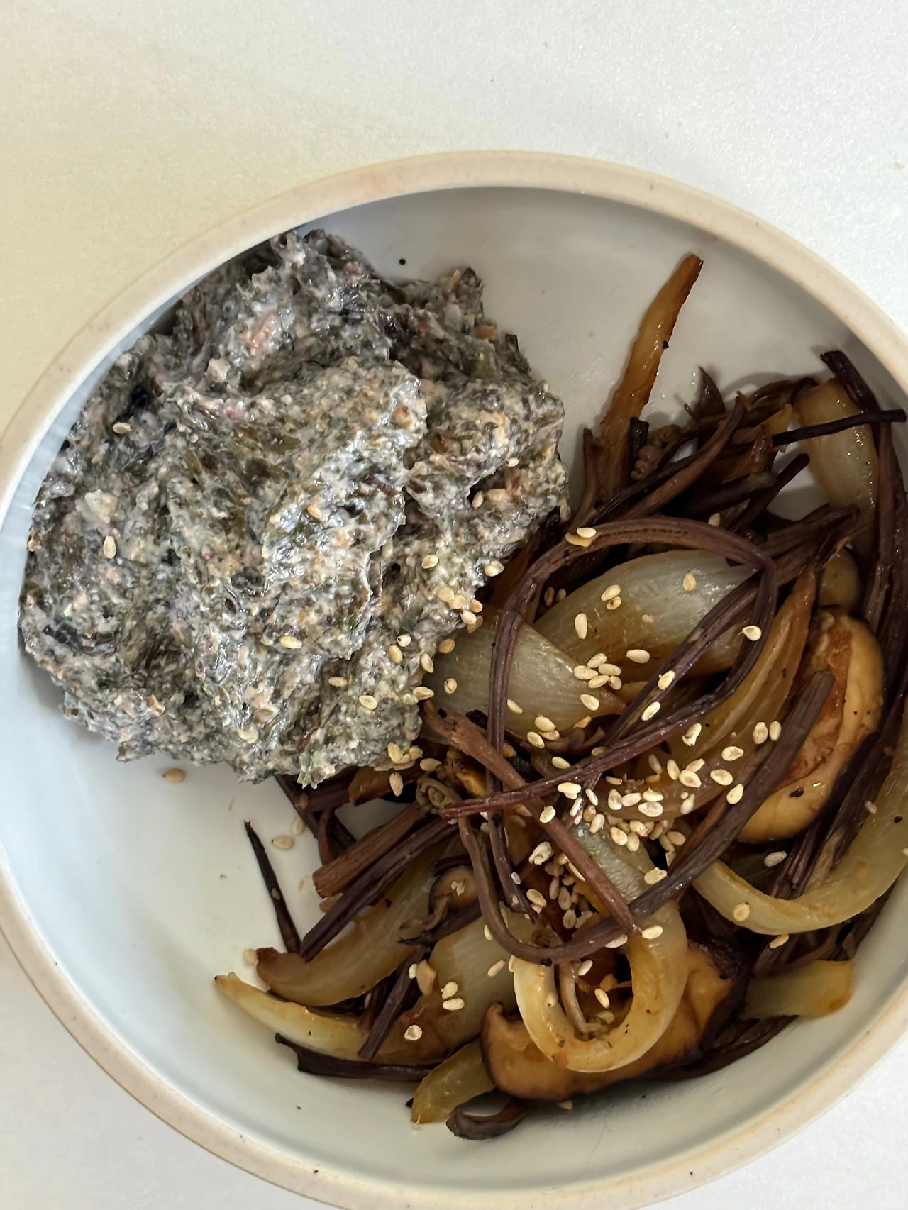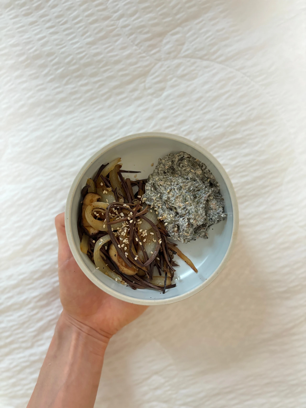 그 전날 우연히 만들게 된 김 두부 크림을 곁들였다. 얼마 전 '마이 리틀 마운틴'이라는 식당에서 '김 페스토 주먹밥'을 맛본 후, 김의 매력에 퐁당 빠져 만들게 된 크림이다. 고소한 고사리 볶음에 바다향이 가득한 부드러운 크림을 올려 첫 입을 맛보았을 때, 나의 몸속 모든 신경의 움직임이 느려졌다. 이 소중하고 엄청난 맛을 천천히, 그리고 신중히 만끽하고 싶었다. 고사리 요리와 찰떡궁합을 이루는, 언뜻 보면 쿠앤크 아이스크림 같은 김 두부 크림의 레시피는 다음과 같다.