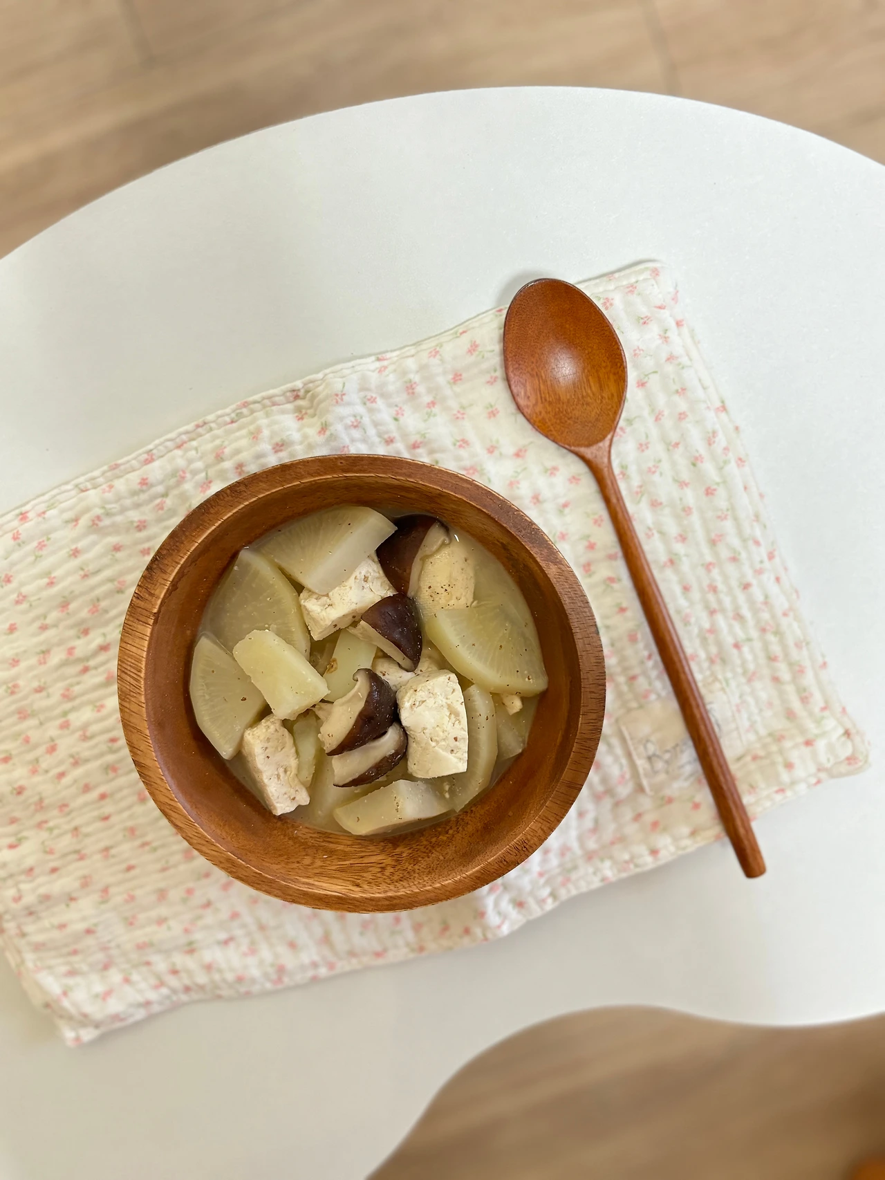 3. 물을 무가 잠길 만큼만 넣고 위와 같이 표고버섯을 넣어준다.
