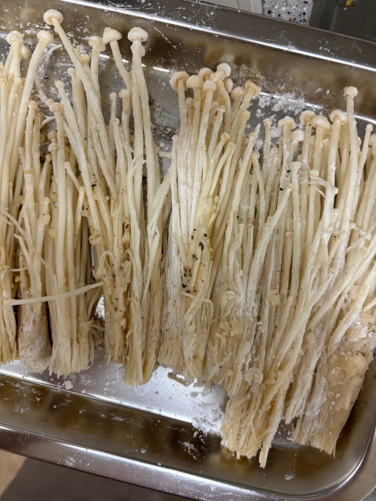 4. 넓은 쟁반에 전분가루를 깔고 3의 팽이버섯 위에 골고루 묻혀준다.