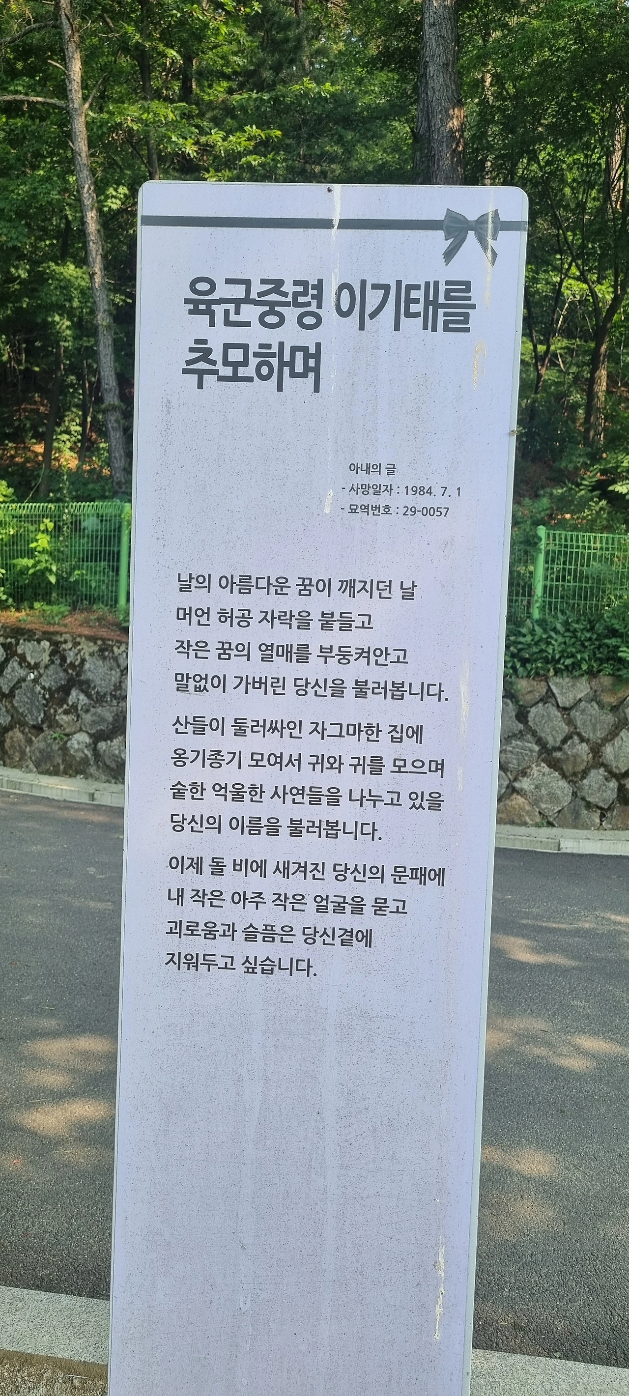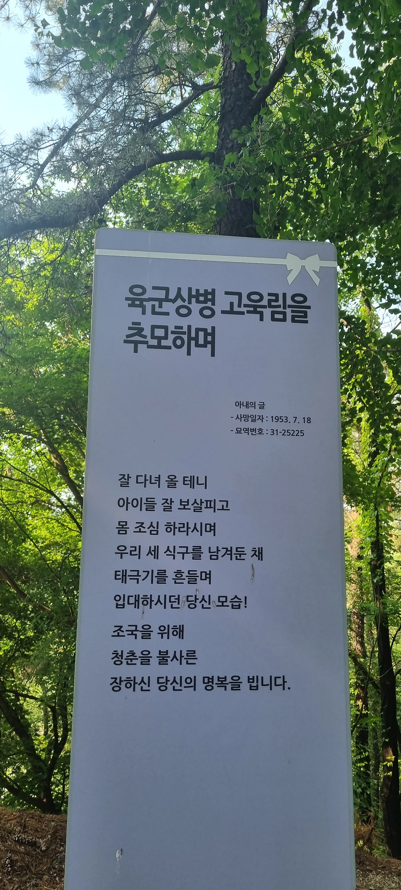 올해 현충일에는 아내의 막내고모가 다녀가셨다는 말을 들었다. 하지만 어딘가 마음 한편에 미처 숙제를 다하지 못한 것 같은 찜찜함이 남아 오늘에서야 아내와 함께 조용히 그곳을 찾았다.