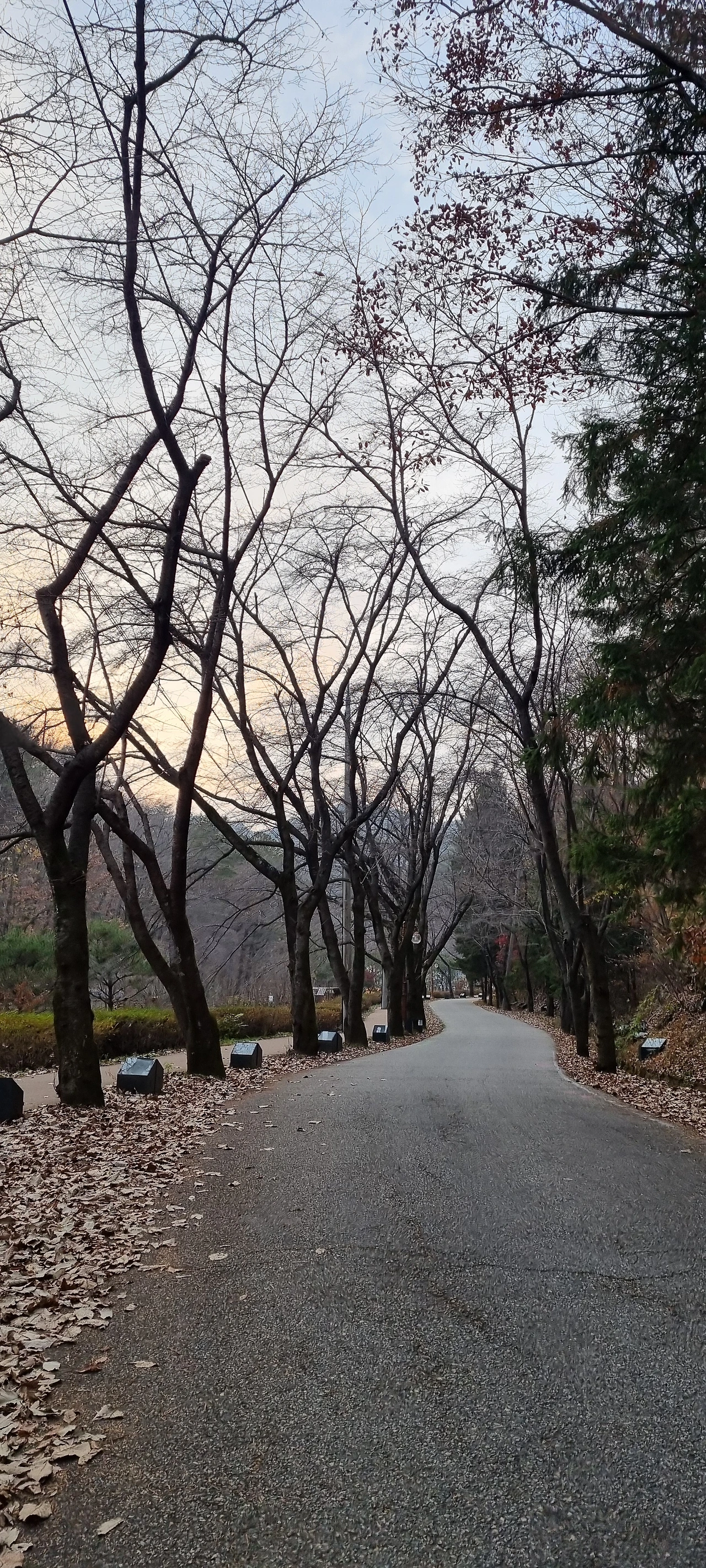 암마이봉과 숫마이봉을 바라보며 늦가을의 정취가 물씬 묻어나는 앙상한 벚나무 가로수가 줄지어 서 있다.