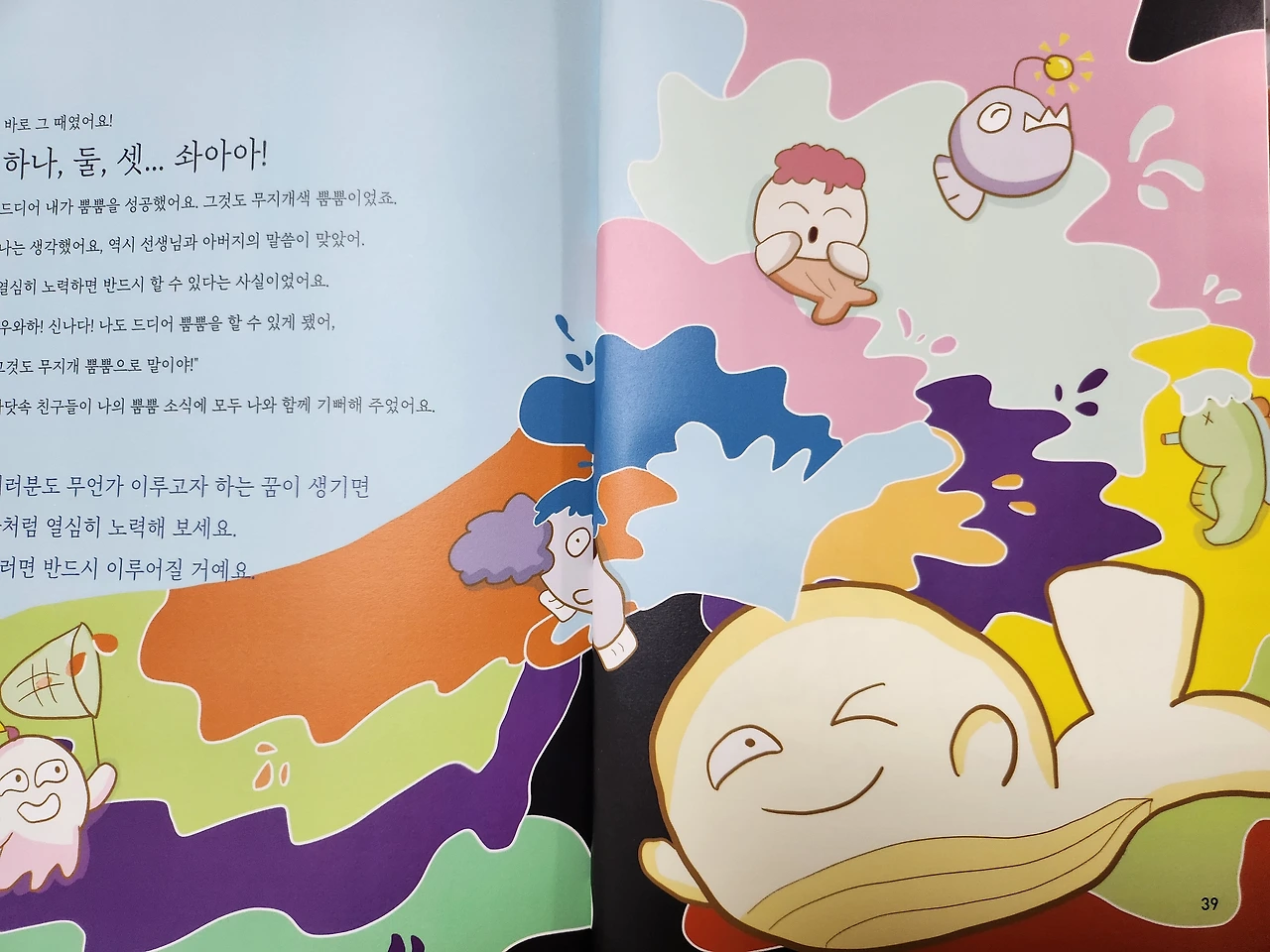 방귀고래 핑구는 어린이들에게 쓸모 있는 실패에 대한 희망적 메시지와 아직 꿈을 이루지 못한 어른들에게도 위로와 응원을 보내고 있습니다. 다만 살짝 아쉬운 점은 이야기의 주제가 핑구가 뿜뿜을 성공하는 과정과 또 하나는 오염수로 인해 망가지는 바다 생태계 이야기로 주제가 두 갈래로 분산되는 것입니다. 그것보다는 핑구의 뿜뿜 성공기 하나만으로도 이야기의 구성이 충분해 보입니다.