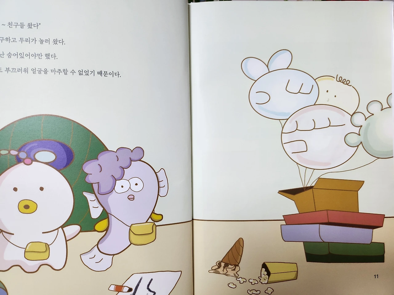 그림을 살펴보면 민보우 그림 작가의 그림은 동글동글 말캉말캉 따뜻하며 표정이나 표현들이 참 사랑스러워 캐릭터와 잘 어울립니다. 어린이는 물론 어른도 호감을 갖게 하고 책의 앞과 뒤 면지에 있는 어린아이 같은 그림은 어린이 독자와 소통하고 싶어 하는 작가의 장난기와 유머가 잘 보입니다. 또 집으로 찾아온 친구들을 피해 풍선 뒤에 숨어있는 핑구의 모습은 모든 그림 중 가장 사랑스러워 저의 원픽 그림입니다.