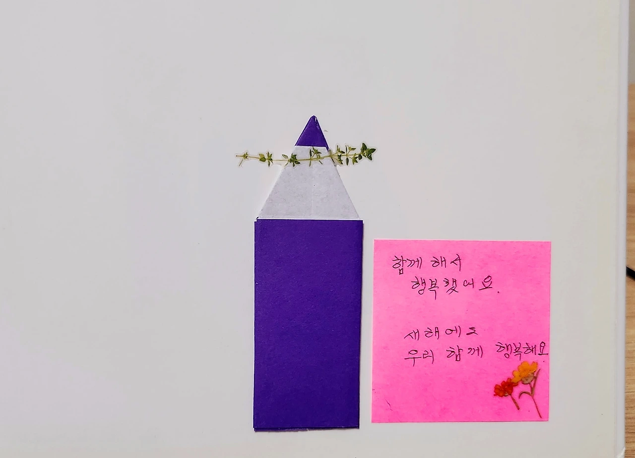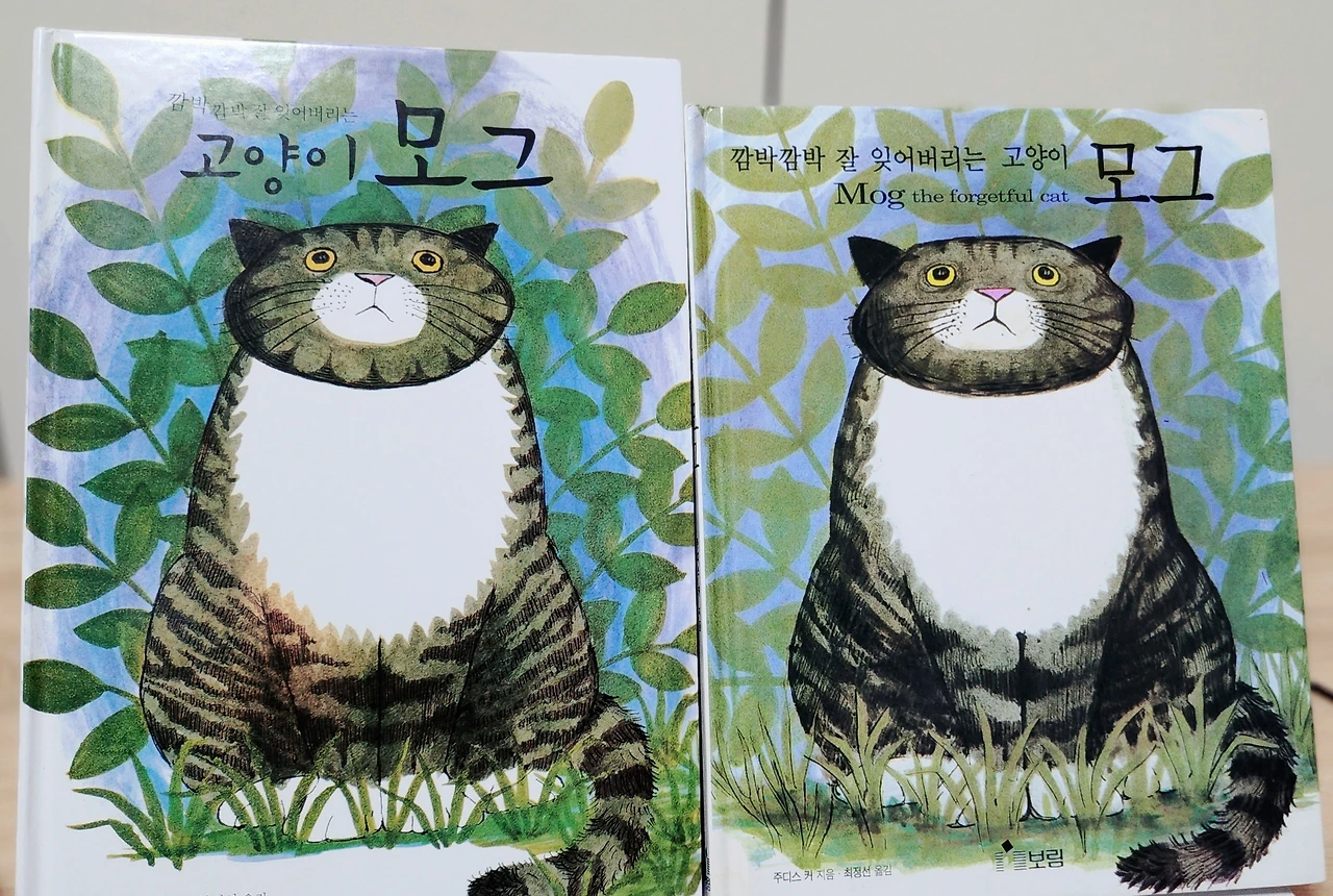 그림책 동아리모임 연말행사는 회원 각자가 소장하는 그림책 중 선물하고 싶은 한 권을 가져와 진열하고 순서를 정하여 원하는 그림책을 뽑는 이벤트이다. 그런데 명흔 작가님이 가져온 그림책이 주디스 커의 <깜박깜박 잘 잊어버리는 고양이 모그>였다. 고양이 모그 시리즈는 주디스 커의 대표작으로 나도 물론 소장하고 있는 책이지만 명흔 작가님의 가져온 책이 특별한 건 <고양이 모그>의 2000년도 초판본 1쇄로 영어 원제목이 함께 표기되어 있는 그림책이라는 것에 의미가 크다. 또 책장을 넘기면 명흔 작가님이 “함께해서 행복했어요.”라고 적은 손 글씨 메모가 있어 더욱 나에게는 소중한 그림책이고 멋진 크리스마스 선물이다.
