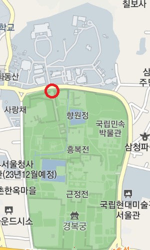 청와대와 경복궁의 자리 배치도, 붉은 원이 신무문이다.