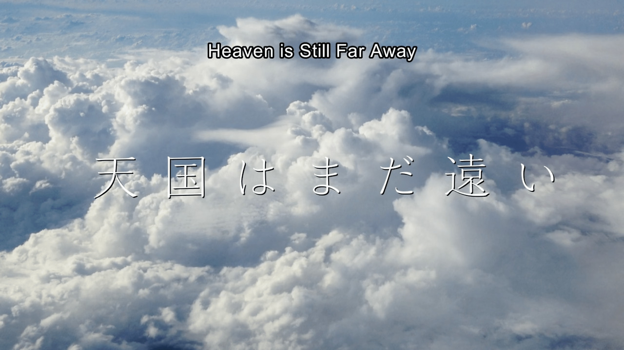 서두에서 <천국은 아직 멀어>라는 제목과 오프닝의 내레이션 사이 불일치를 언급한 바 있다. 차이점은 부사 하나다. 오프닝 내레이션에서 미츠키는 천국은 아직 '꽤, 상당히(随分)' 멀다고 말하며 스크린에 처음 등장한다. 엔딩은 오프닝보다 더 높은 곳에서 하늘을 내려다보는 쇼트와 함께 미츠키의 내레이션이 낭독되는 수미상관 연출로 장식된다. 엔딩의 내레이션은 부사가 생략된 원제 그대로의 '천국은 아직 멀어'다. 이를 말하기 직전의 내레이션도 유사한 형식으로 반복된다. 오프닝에서 천국에 간다는 어머니의 말을 "믿지 않았다(信じてたわけじゃないけど)"는 대사가 엔딩에서는 천국이 있다는 것을 "믿지 않는 것은 아니다(信じてないわけじゃない)"로 변주된다. 어렸을 적 천국을 믿지 않던 미츠키는 엔딩 시점에서는 최소한 믿지 않는 것은 아닌 상태가 되었다. 오프닝의 구름은 손에 잡힐 듯 가까이 있었다면, 엔딩의 구름은 전보다 까마득히 멀어졌다. "이 비구름 저편에는 천국이 있다(この雨雲の向こうには天国がある)"라는 미츠키의 대사로 보아, 구름과 멀어진 만큼 천국에 가까워졌다고 볼 수 있다. 미츠키에게 꽤 멀던 천국은 그냥 먼 천국이 되었다.