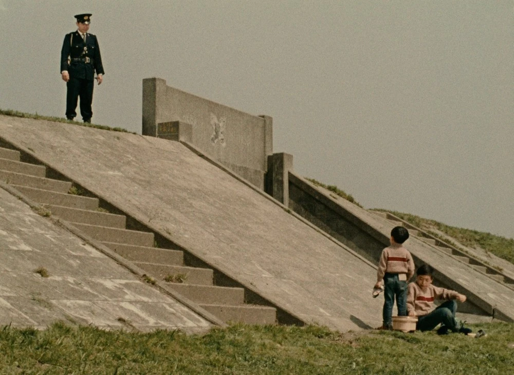 영화의 첫 장면은 인물의 생활 공간과 시대적 배경을 설명하고 관객을 그들의 일상으로 인도하는 기능을 한다. 송전탑과 나란히 늘어선 주택 단지의 모습이 담긴 풍경 쇼트가 보인다. 마주 보고 있는 집들 사이로 높은 제방이 있고, 그 위로 등굣길에 나서는 아이들이 보인다. 거대한 송전탑과 길게 늘어진 전선, 하나같이 똑같은 주택의 디자인은 이 마을이 전후에 개발된 신흥 계획 주택 단지임을 명시한다. 오프닝에서 등교하는 아이는 총 네 명이다. 미노루와 이사무, 텔레비전을 가진 젊은 부부네 아들 젠, 방귀를 뀌다 바지에 실수하는 코우죠. 젠의 부모는 텔레비전을 보러 오는 아이들을 살갑게 맞아주지만, 구세대로 가득한 마을에 정착하지 못하고 이사한다. 엔딩에 이르면 똑같은 등굣길에 아이는 세 명만 남는다. 마을의 텔레비전은 한 대로 유지된다. 그런데 젠 가족이 이사하는 과정은 묘사되지 않는다. 짐을 나르는 이삿짐 트럭도 없고, 갈등의 단초가 되는 세탁기, 텔레비전 등의 가전을 실어 나르는 차량도 보이지 않는다. 마을을 출입하는 장면은 전부 소거되어 있다. 아이들이 주인공인 영화에 학교는 겨우 한 번 등장할 뿐이다. 이 마을은 마치 외부와 격리된 별도의 영화 세트처럼 보인다. 그런 고립된 공간에도 텔레비전은 도착한다.