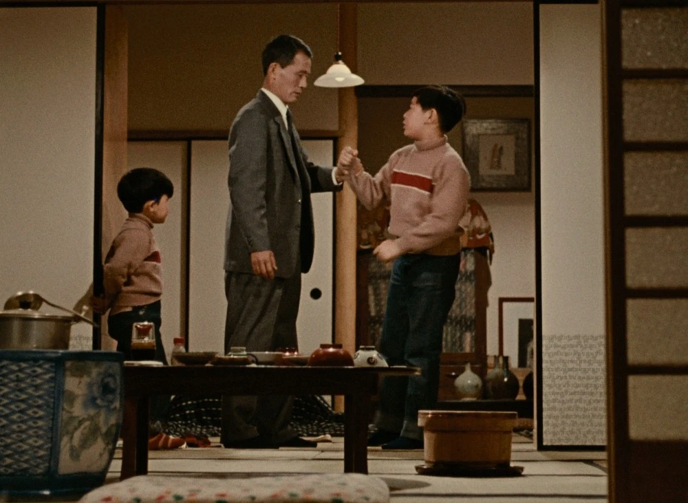 1950년대 후반 일본 사회는 한국전쟁 특수로 경제를 재건하고 고도 성장기에 진입하여 물질적 풍요를 누리고 있었다. 이때 일본 가정에 대량 보급되기 시작한 세 가지 가전제품인 텔레비전, 냉장고, 세탁기는 일본 건국 신화의 삼종신기에 빗대어 삼신기로 불렸다. 영화에서 코우죠의 어머니가 부녀회비를 빼돌렸다고 의심받은 이유도 신형 세탁기를 구매해서였다. 집집마다 보급되기 시작한 삼신기는 공동체에 균열을 일으키는데, 큰 비극을 초래하지는 않고 마을 구성원이 재편되는 데 그친다. 이 영화가 인물들을 은근히 죽음의 위협에 노출시킨다는 것을 인지해야 한다. 코우죠의 할머니가 식칼로 연필을 깎아 방문판매원을 내쫓는 장면이나 자신의 딸과 비정한 말을 주고받는 장면을 떠올려 보자. "돌아가실 때가 되셨나?", "말썽쟁이 아들이나 낳고선 잘난 척은". 미노루 형제가 갈아먹던 경석에 쥐약을 바르겠다는 어머니의 대사는 또 어떤가. 천만다행히 사건으로 불거지지는 않았으나 무심코 넘기기에는 아주 섬뜩한 순간들이다. 각 가정에 틈입한 문명의 이기는 이전의 오즈 영화에서 보아왔던 정물들과 달리 서늘한 불온함을 생산한다.